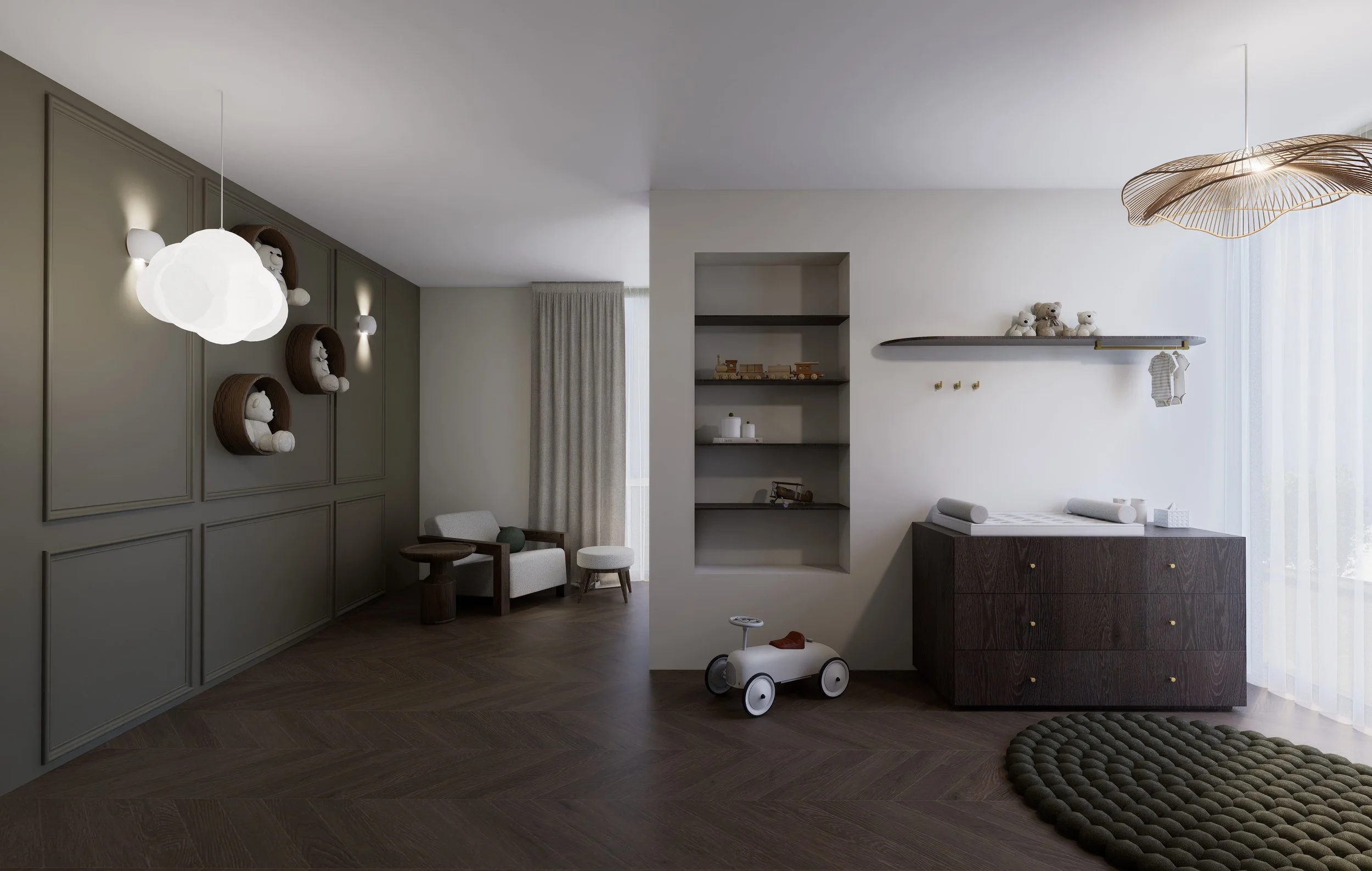 Gedurende het proces hebben we ook gekeken naar het toekomstperspectief van de kamer, zodat deze eenvoudig aangepast kan worden naarmate de baby groeit en nieuwe behoeften ontstaan. Dit ontwerp biedt de mogelijkheid om de kamer zonder grote ingrepen om te vormen tot een kinderkamer en later zelfs tot een tienerkamer.