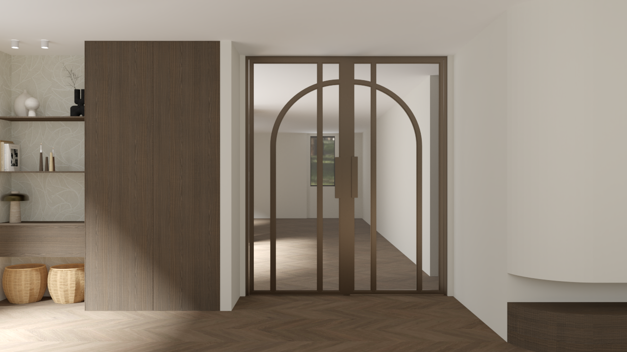 Om een duidelijke scheiding te maken tussen de woonkamer en de toekomstige keuken, hebben we een elegante dubbelzijdige stalen deur geplaatst. Deze deur is niet alleen functioneel, maar voegt ook een verfijnde en moderne touch toe aan het ontwerp.