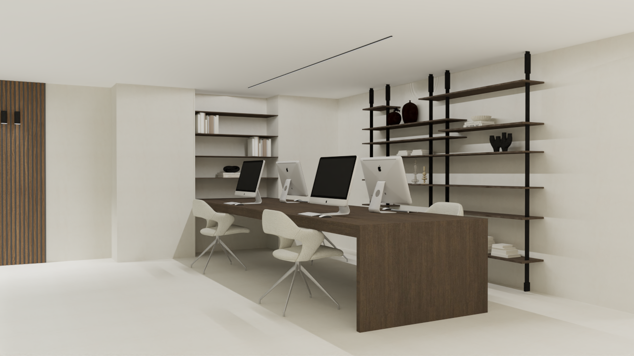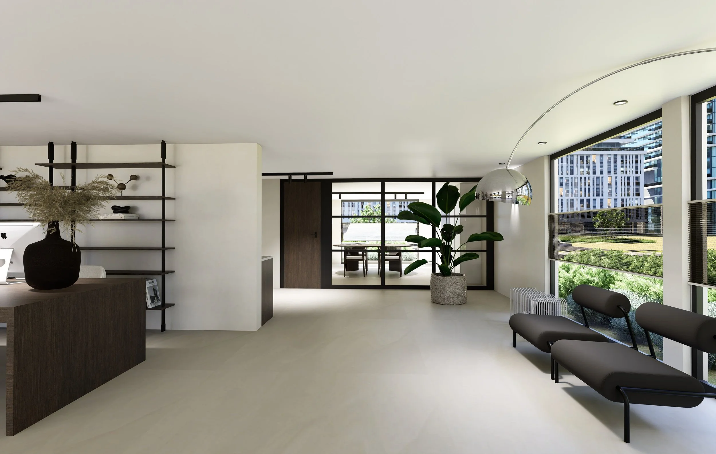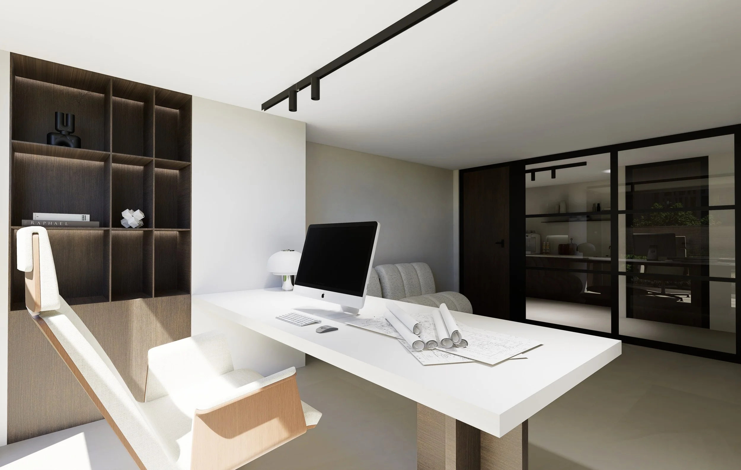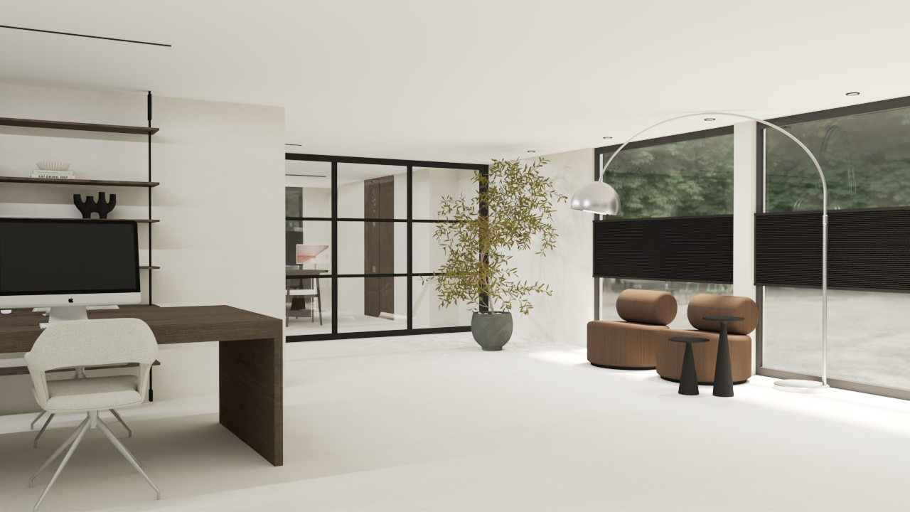 De interieurstijl is een doordachte keuze: een verfijnde mix van Monochromatic en Japandi. Monochromatic brengt rust door een palet van neutrale kleuren, met subtiele schakeringen die elegantie en eenheid uitstralen. Japandi voegt daar een warme, natuurlijke dimensie aan toe, met het gebruik van hout, zachte texturen en minimalistisch design. De combinatie van deze stijlen creëert een harmonieuze werkomgeving die niet alleen praktisch is, maar ook visueel inspirerend.