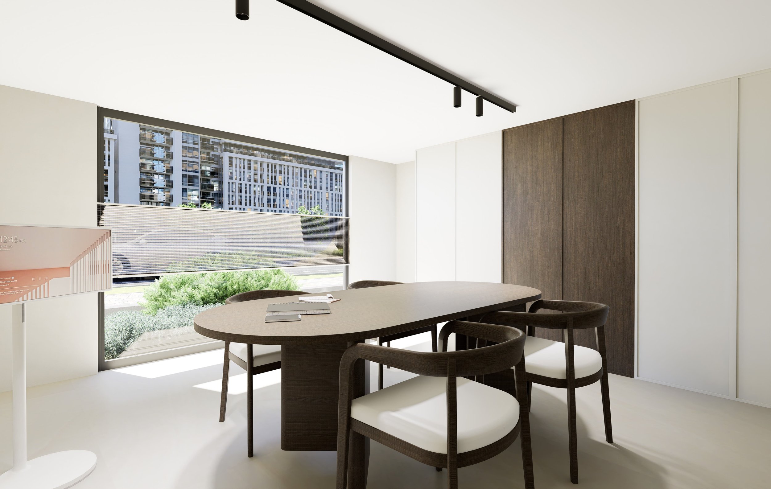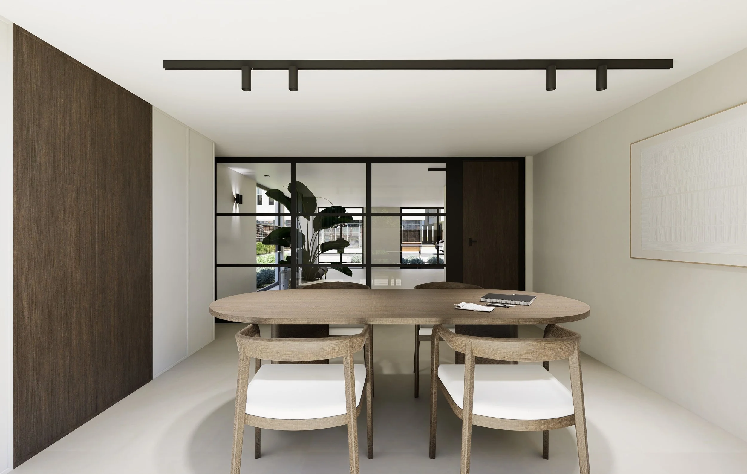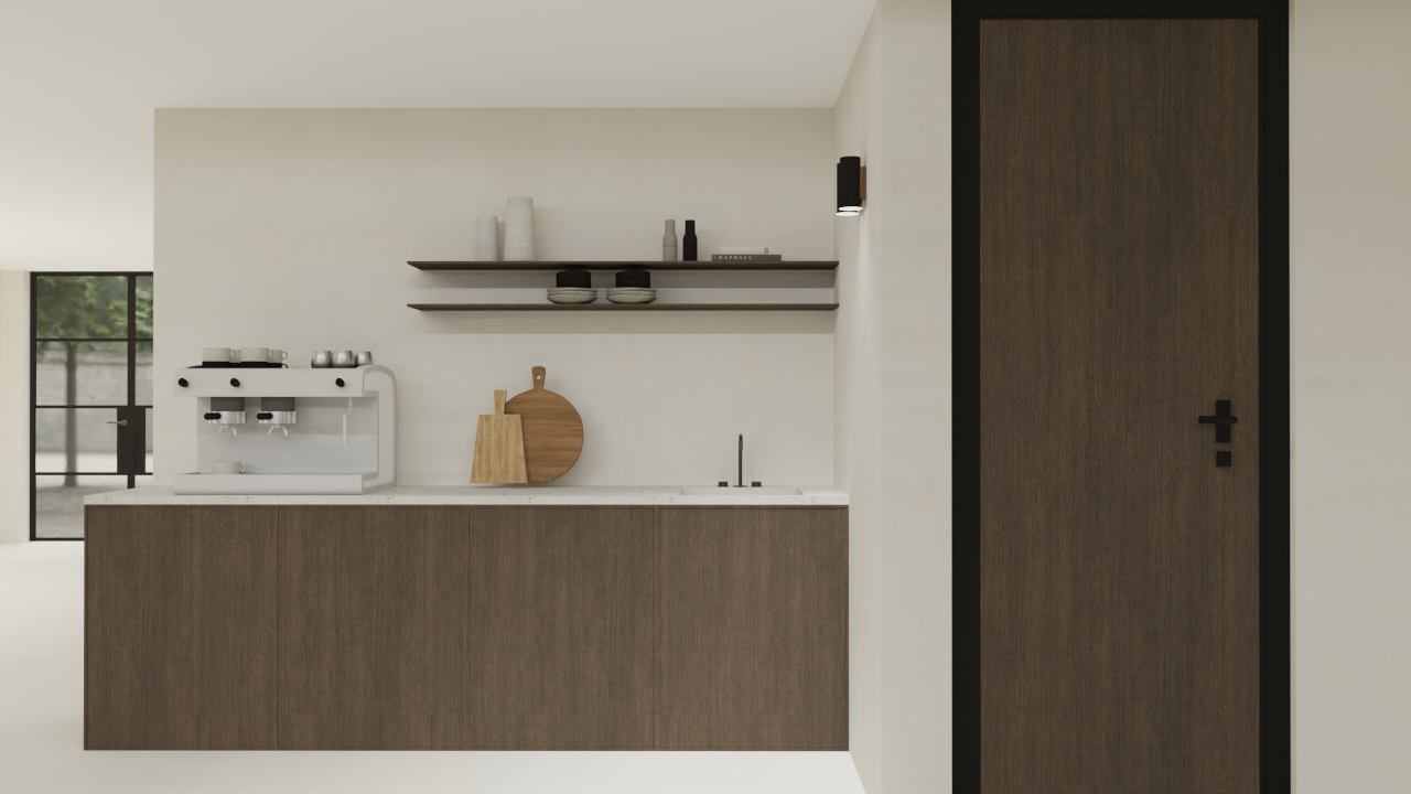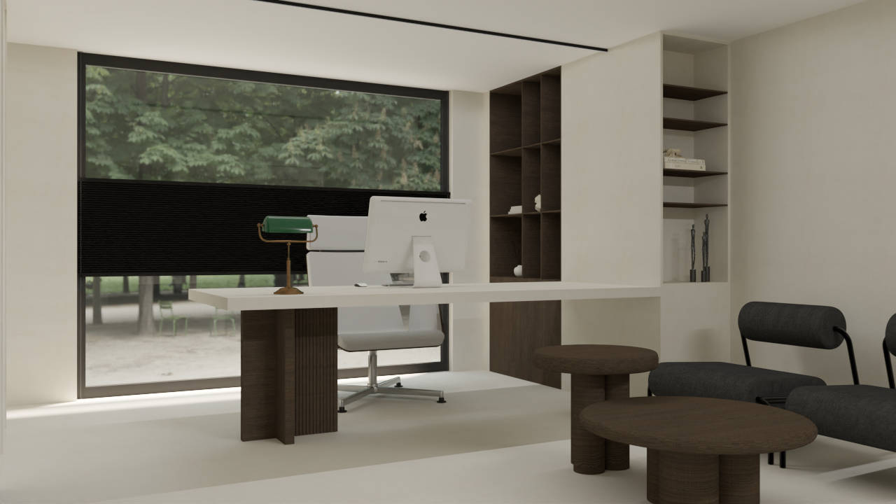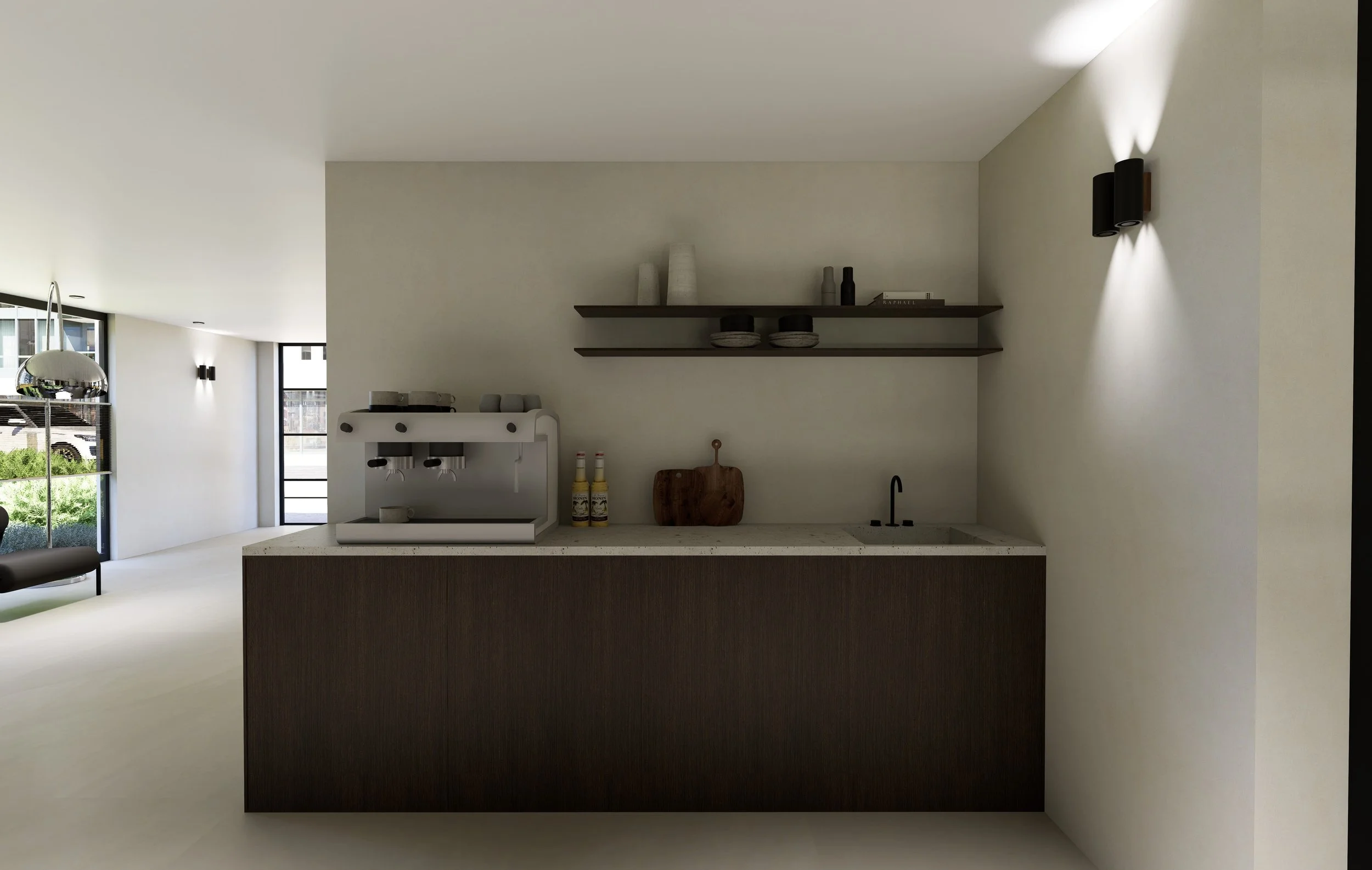 De interieurstijl is een doordachte keuze: een verfijnde mix van Monochromatic en Japandi. Monochromatic brengt rust door een palet van neutrale kleuren, met subtiele schakeringen die elegantie en eenheid uitstralen. Japandi voegt daar een warme, natuurlijke dimensie aan toe, met het gebruik van hout, zachte texturen en minimalistisch design. De combinatie van deze stijlen creëert een harmonieuze werkomgeving die niet alleen praktisch is, maar ook visueel inspirerend.