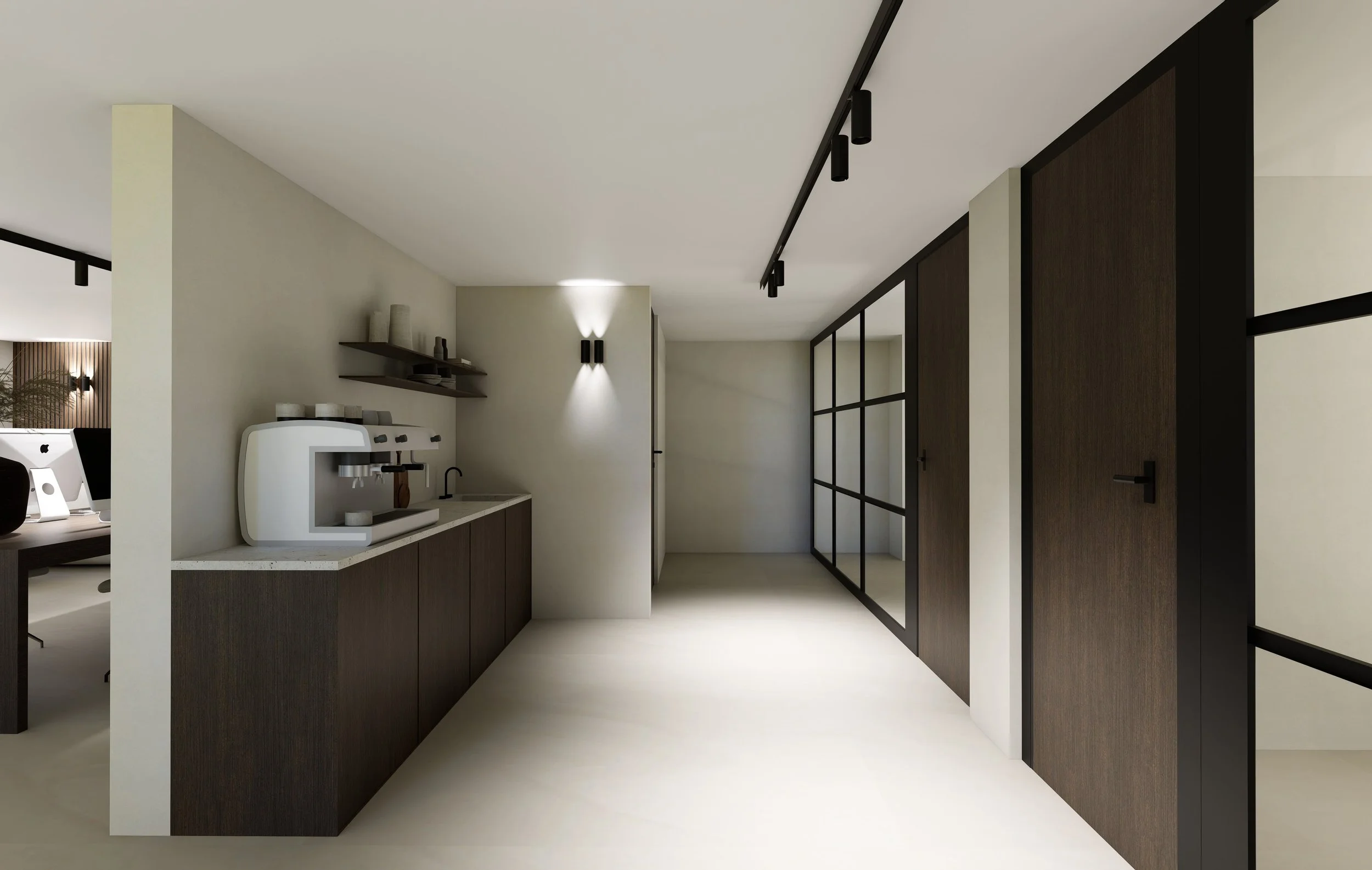 Tussen deze zones is ruimte gemaakt voor een praktische keuken en de wc, waardoor het kantoor niet alleen esthetisch aantrekkelijk is, maar ook zeer functioneel.
