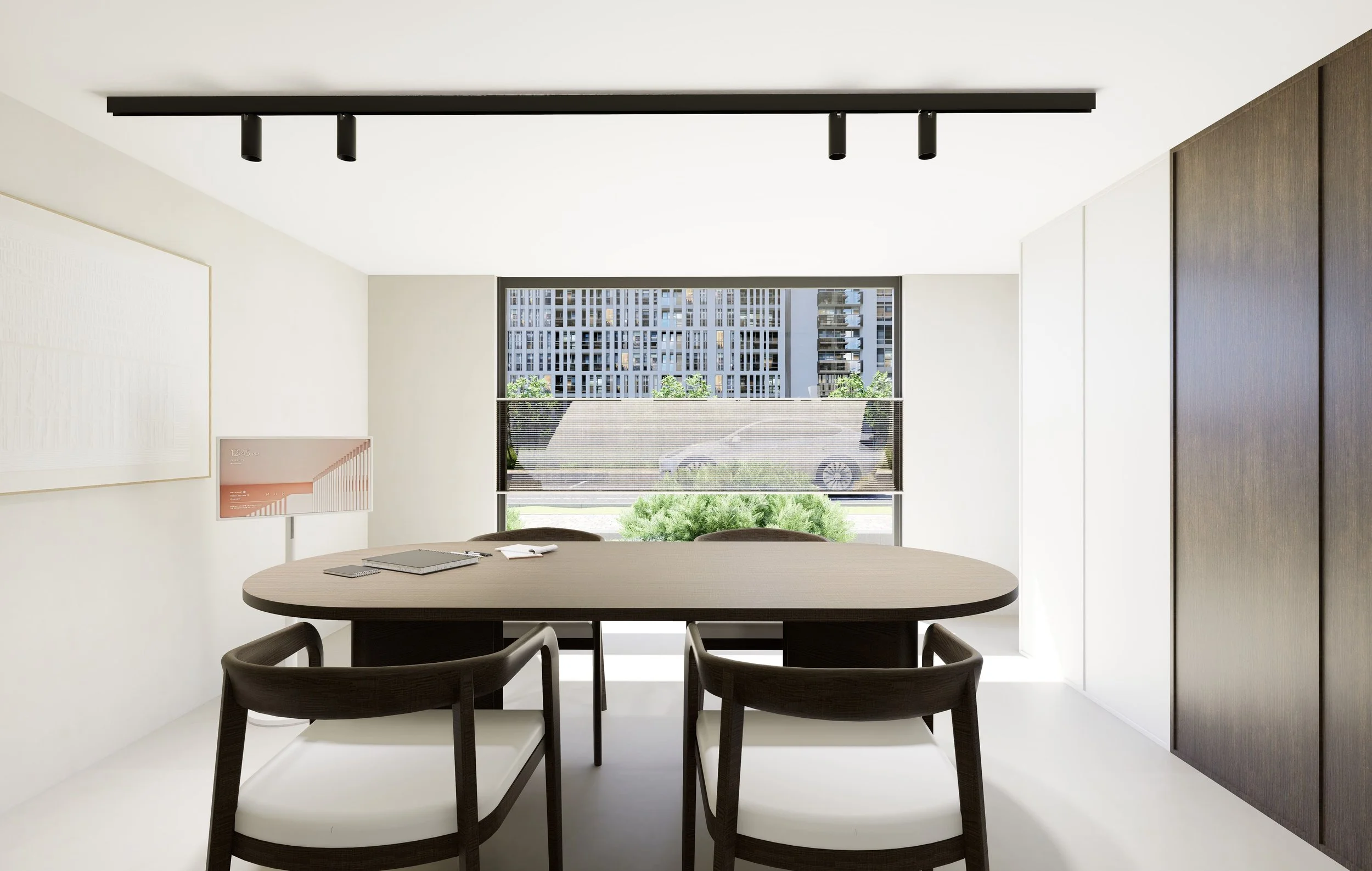 Daarnaast hebben we aandacht besteed aan details zoals verlichting, die bijdraagt aan de sfeer en de productiviteit bevordert. Strategisch geplaatste planten en subtiele decoratieve elementen brengen een vleugje natuur naar binnen, wat een gevoel van balans en welzijn versterkt.