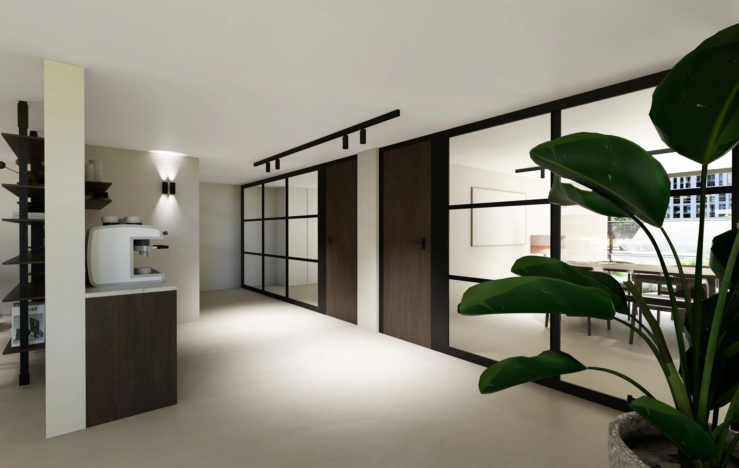 Voor een zakelijke opdrachtgever in Leiden mochten wij een kantoorruimte ontwerpen die functionaliteit en stijl perfect met elkaar verbindt. De ruimte is ingericht met een open entree, waar medewerkers comfortabel aan hun werk kunnen, en loopt vloeiend over naar de achterzijde, waar een vergaderruimte en een privéruimte voor de ondernemer zijn gecreëerd.