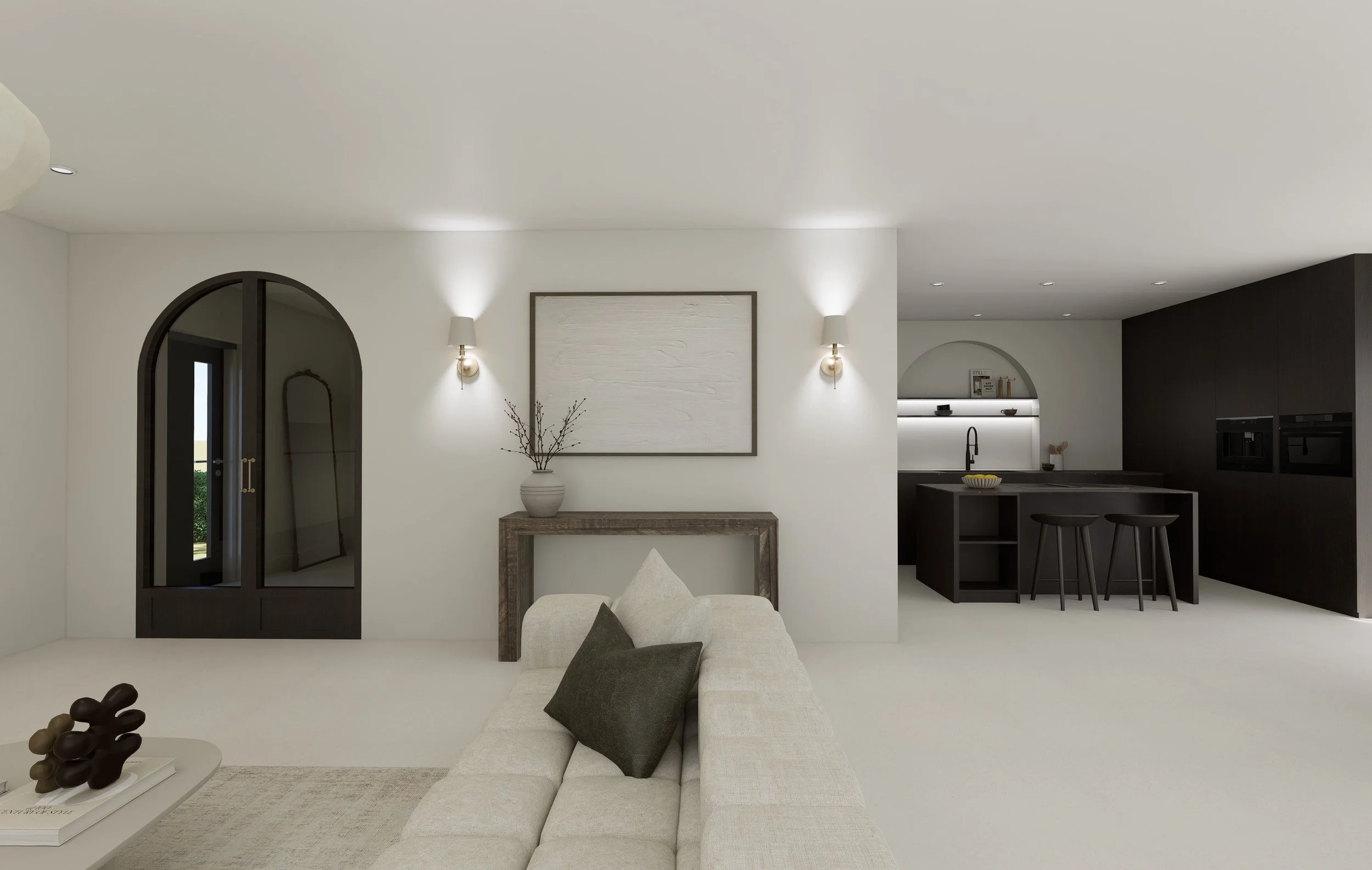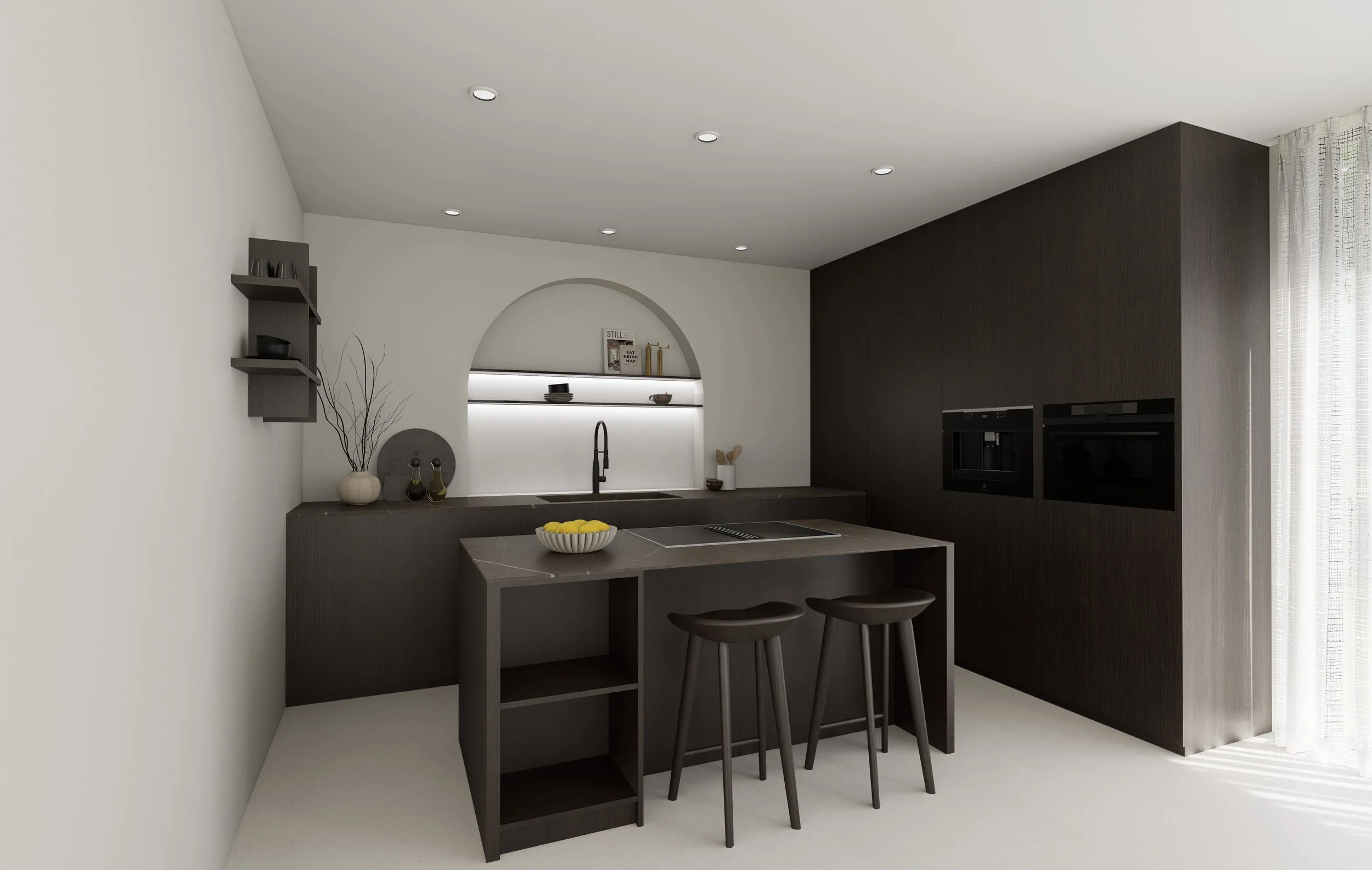 We hebben de interieurstijl voor dit ontwerp gebaseerd op Japandi en Organic Modern. De Japandi interieurstijl is doorgevoerd in het gehele ontwerp, waarbij we gebogen nis hebben gecreëerd en deze een subtiele organische touch hebben gegeven. Om extra karakter te brengen in het interieurontwerp, hebben we de Organic Modern interieurstijl toegepast in de kleine details. Door de combinatie van Japandi en Organic Modern stijlen ontstaat er een rustige, verfijnde sfeer die tegelijkertijd warmte en karakter uitstraalt.